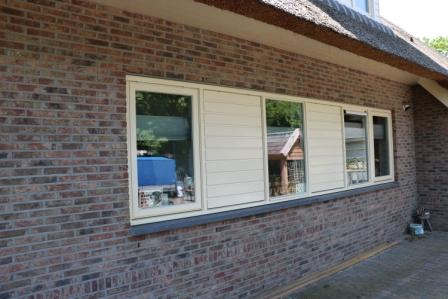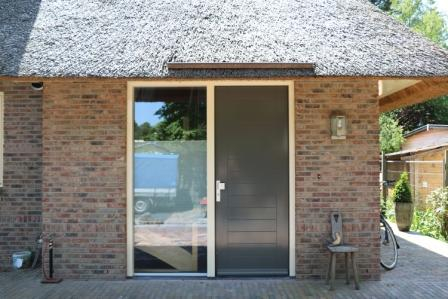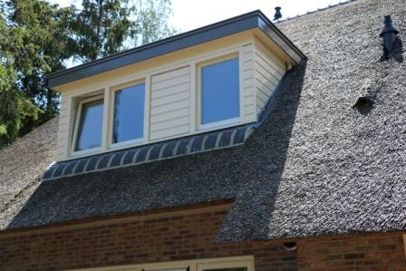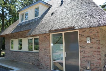 Ook aan de details is bij dit nieuwbouwproject gedacht. Het rieten dak maakt de woning landelijk en autohentiek. Maar ook aan kleine details is gedacht. Zo ziet u onder de kozijnen op de tweede foto natuurstenen dorpels.
