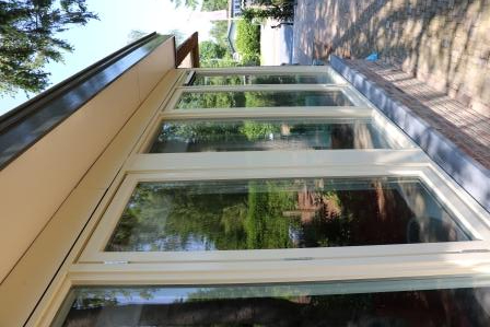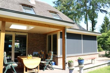 Aan de achterkant van de woning bevindt zich zowel een serre als een veranda. Om te voorkomen dat er te weinig licht het huis binnen komt bij de veranda, is deze voorzien van een lichtkoepel.