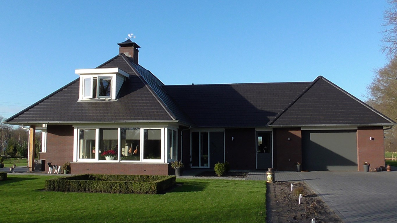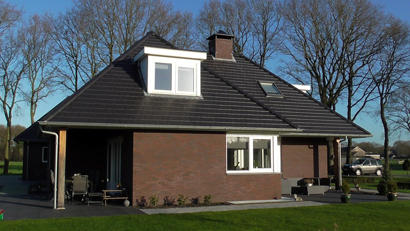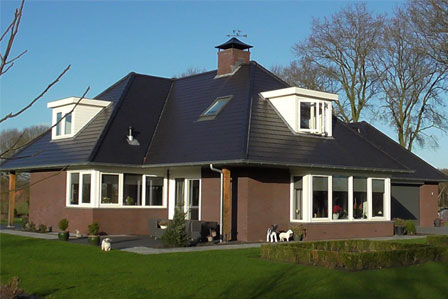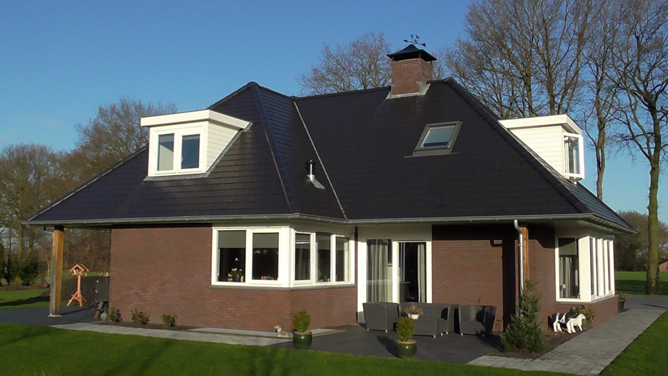 Op het eerste gezicht zou je denken dat op het dak van de woning leitjes liggen. Dit zijn echter dakpannen.
