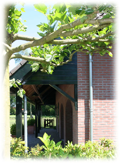 Aan de voorzijde van deze schuur ziet u 2 garages en 2 paardenstallen. Op de tweede foto is duidelijk te zien hoe het dak doorloopt als overkapping over de stal en garages heen.